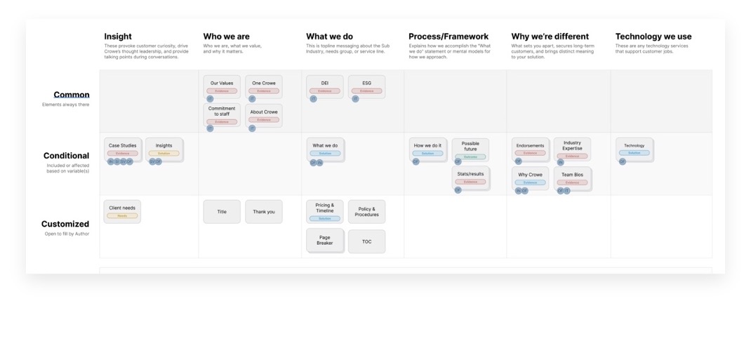 First, we worked with the Consulting firm’s strategy team and AA leadership to collect and categorize content as common, conditional, or customizable. From there, our team created a structured framework that gives SMEs a systemic, repeatable foundation to build out proposals that contain a consistent look, feel, and tone.