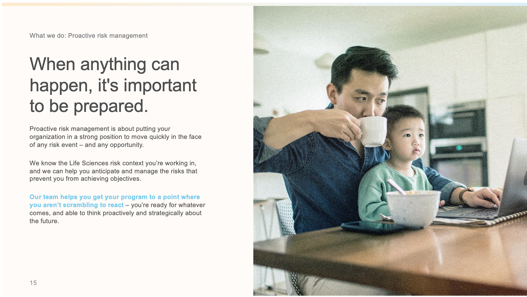 We at LaFleur Marketing created a unique new sales tool: a comprehensive set of stories that details the breadth of the Consulting client’s industry-specific value. This guided Storykit is an easy-to-use, modular presentation that gives SMEs the flexibility to tell a consistent, resonant story that can be easily and effectively tailored to any situation.